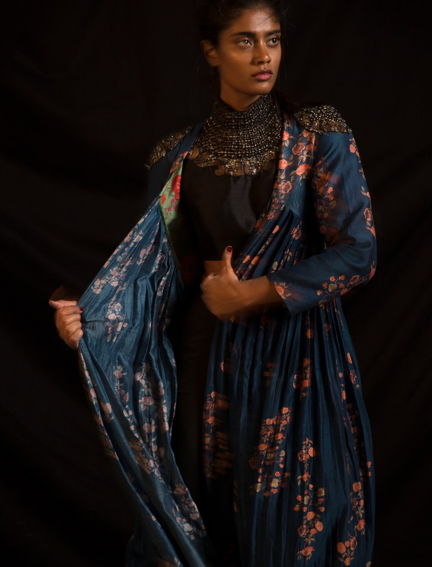 The Armourage woman is clearly ready to rumble in tough silhouettes (hello, boyfriend jacket, trench coats, and vests) but equally unafraid to pair these with billowy, flowy pieces that mimic her autonomous state of mind. She loves the burst of warmth and spirit that florals come with, but here, they take on a dramatically ethereal, noir spirit. The strong shoulders and no-nonsense stripes put a subversive spin on power dressing by happily mingling with the rampant micro-pleating that pumps in that timeless feminine charm. The romance of chiffon and chanderi meets the ferocity of raw silk. In terms of the palette, passionate reds and enigmatic blacks are complemented by the calmness of blues and freshness of greens.